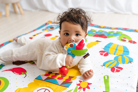 The Fiesta Playmat to Bag is the perfect playmat for on-the-go fun and tummy-time, including all kinds of stimulation with a rattle, teether, and mirror – plus room on the pad for socializing with a friend. Perfect for an impromptu picnic on the grass! The playmat is machine washable and features three playful ‘peek-a-boo’ crinkly flags that stimulate the baby's sense of touch. It's great for indoor and outdoor activities!